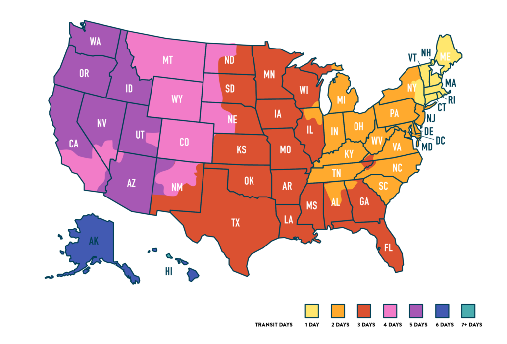 - FedEx Ground Service: 1 – 5 business days, including Saturdays within the contiguous U.S. (see map below)